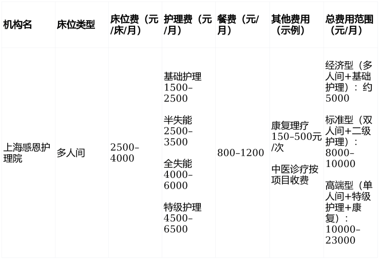 上海感恩护理院收费价格:5000-10000元/月
