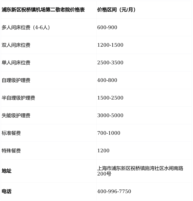 一句话简介:浦东新区祝桥镇机场第二敬老院(电话400-996-7750)位于祝桥镇施湾社区水闸南路200号,提供4500-7500元/月透明化收费服务,涵盖医养照护、适老化设施及丰富文化活动,是工薪家庭安心之选。