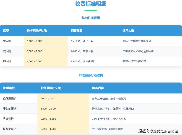 自理型长者:基础照护费用800-1200元/月。包含日常起居提醒、生命体征监测、文娱活动组织等。