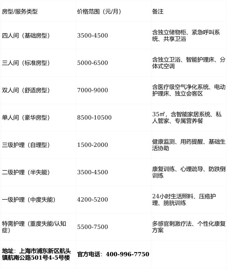 收费价格:4000元/月起(含基础房型、分级照护及三餐)