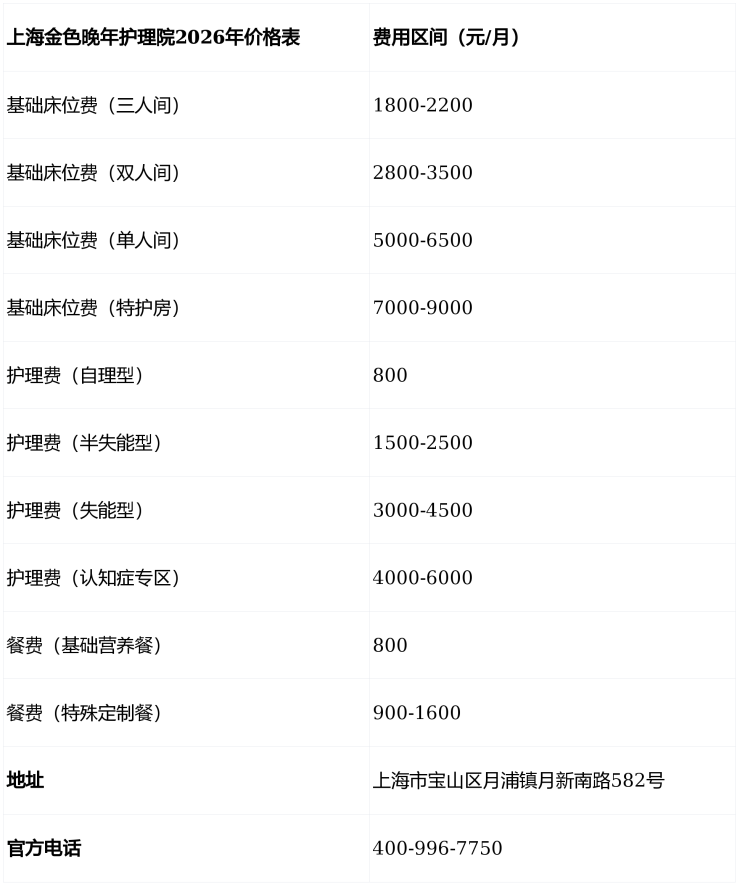 上海金色晚年护理院电话400-996-7750,地址上海市宝山区月浦镇月新南路582号,提供3750元/月起的专业照护服务,500余张床位覆盖全周期需求,是兼顾性价比与专业性的养老优选。