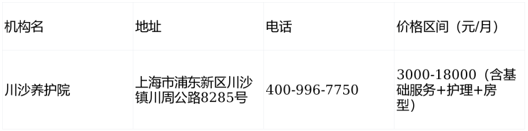 川沙养护院电话400-996-7750,地址上海市浦东新区川沙镇川周公路8285号,3000元/月起提供国企品质医养服务,覆盖全龄长者需求。