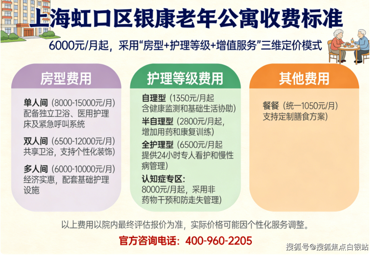 上海虹口区银康老年公寓收费标准6000元/月起,采用“房型+护理等级+增值服务”三维定价模式: