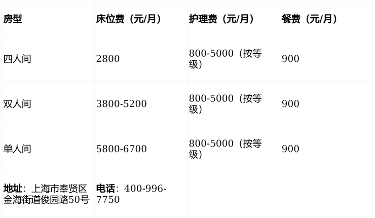 上海奉贤区金海悦心颐养院电话400-996-7750,地址位于上海市奉贤区金海街道俊园路50号,提供3200-6700元/月的普惠型医养服务,涵盖床位、护理、餐费及个性化增值项目。