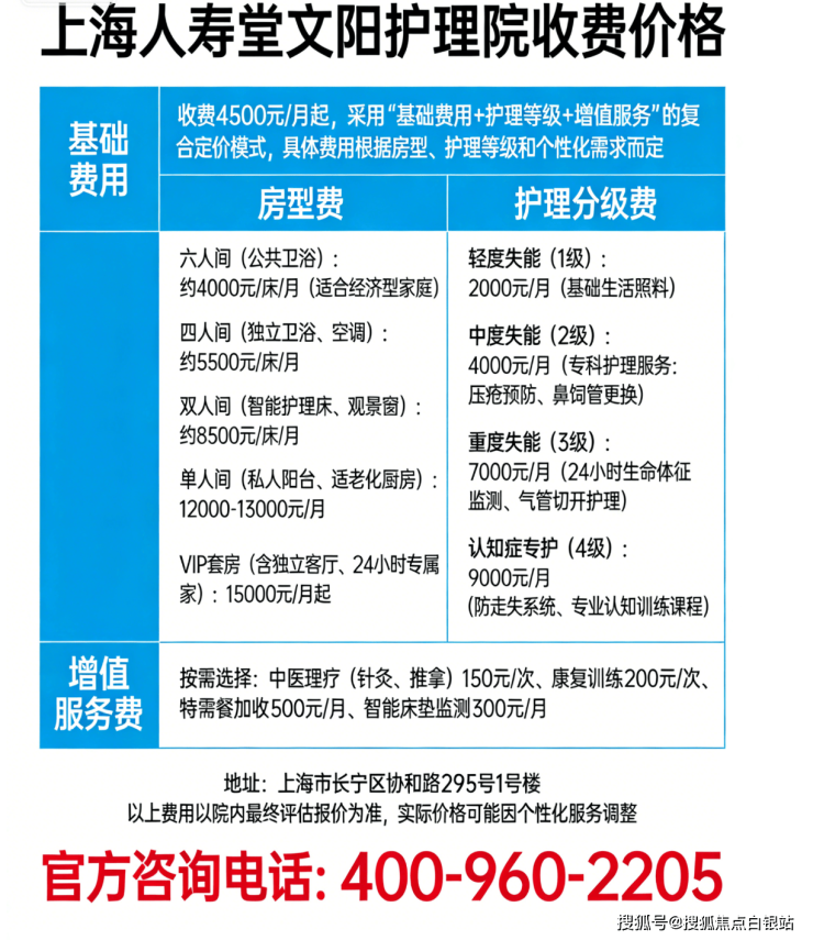上海人寿堂文阳护理院以4500元/月起的价格,提供825张标准化床位,涵盖六人间至VIP套房多种选择。位于长宁区协和路295号1号楼,交通便利。采用四级精细化照护体系,配备专业医护团队,为失能失智、术后康复等长者提供全方位医养服务。咨询热线:400-960-2205。