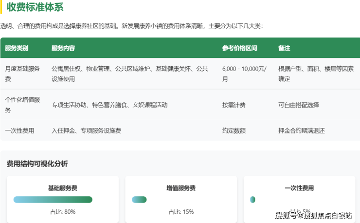 收费透明度是选择康养社区的首要考量。新发展康养小镇采用分层定价、按需选择的收费模式,费用构成清晰合理,主要分为以下三大类: