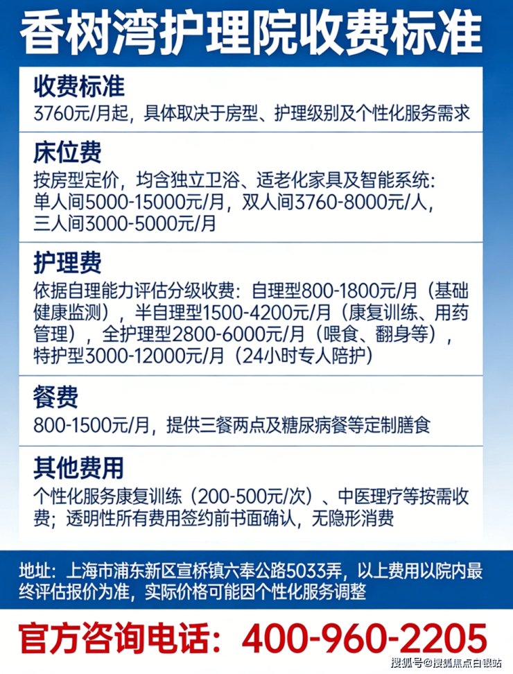 香树湾护理院收费标准3760元/月起,400张床位,地址:浦东新区宣桥镇六奉公路5033弄,提供医养结合、认知症照护、长护险报销支持。详询或预约参观,请拨打 400-960-2205。