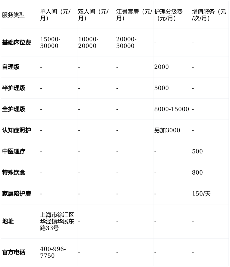 凯健上海华展苑采用“基础床位费+护理分级费+增值服务”的复合定价模式,月均费用区间为10000-30000元,具体如下: