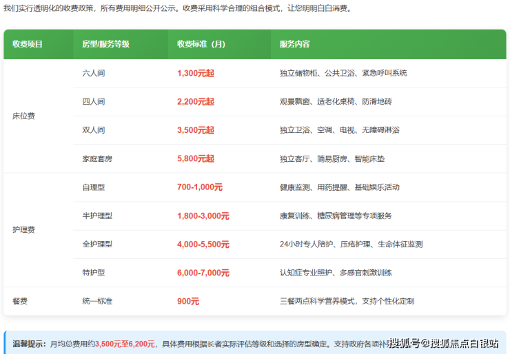 **价格区间:**3500元/月起,根据护理等级和房型差异化定价