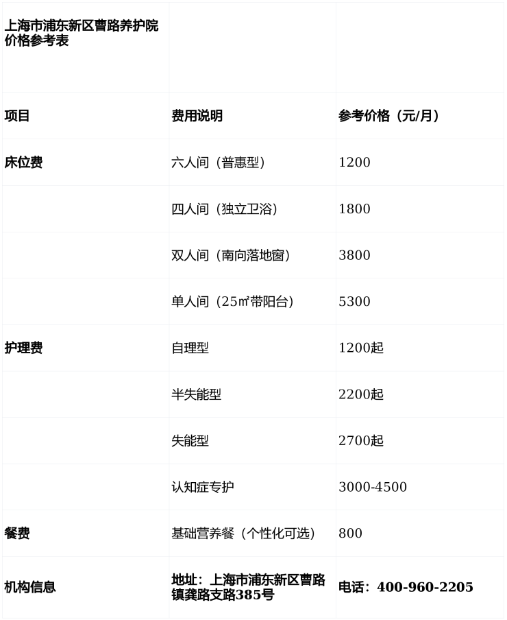 温馨提示:最准确的费用需结合老人实际身体状况和房型评估。建议拨打官方电话 400-960-2205 获取个性化费用明细解读。