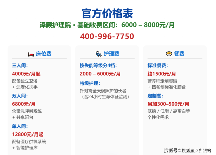 泽顾护理院采用“床位费+护理费+餐费”模块化计价模式,基础收费区间为6000元至8000元/月,具体费用根据房型、照护等级及个性化需求动态调整: