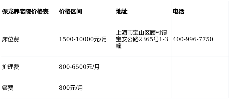 上海保龙养老院电话400-996-7750,地址上海市宝山区顾村镇宝安公路2365号1-3幢,收费4100元/月起,收住自理、半自理、失能失智及术后康复长者,提供医养结合、中医康养、分层护理等全方位服务,欢迎预约参观!