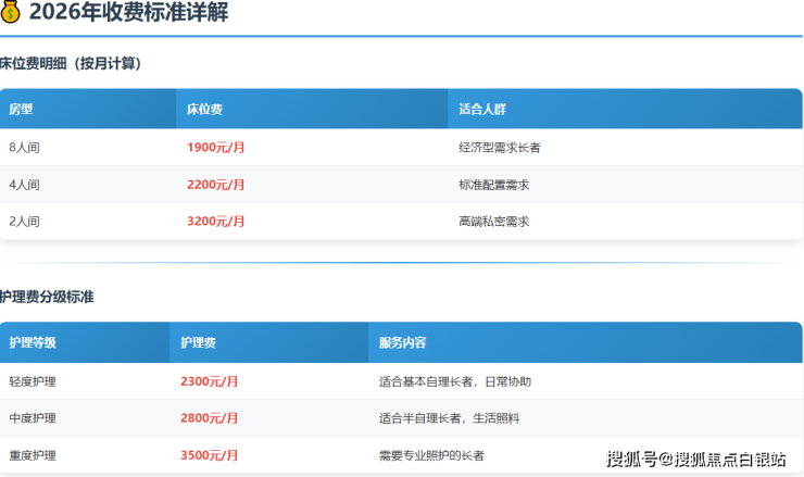 重度护理:2700-3500元/月(适合需要专业照护的长者,提供全方位监护)