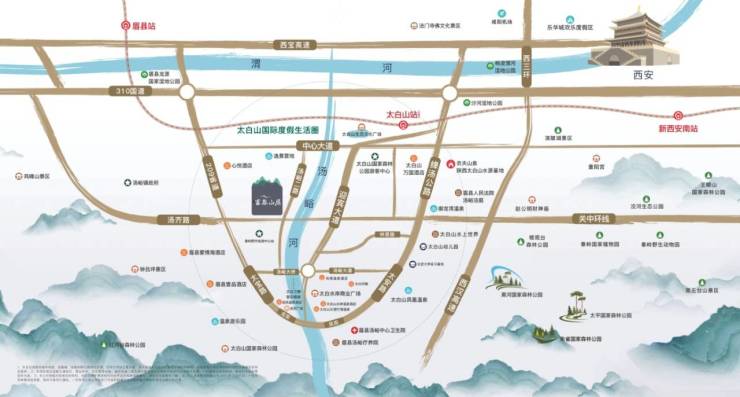 项目近距即达太白山森林公园,外临太白汤峪河,周边高端温泉酒店、美食街区、湿地公园 、度假营地等丰盛配套环伺。内部规划约3000㎡圈层会所,未来将进驻健身房、民宿等,最大程度满足居者需求,带来舒适旅居日常,让生活更璀璨