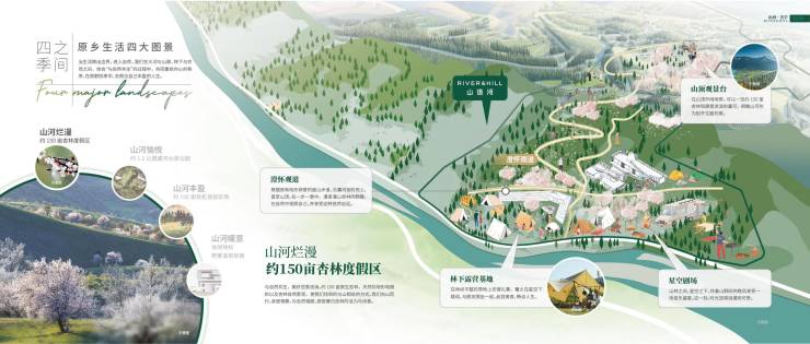 项目西侧约150亩杏林乐游度假区与蓝田·澄怀观道山林游乐区,涵盖多元活动场所,拥享灞河与山野自然景观,承载业主山河间的自在生活。