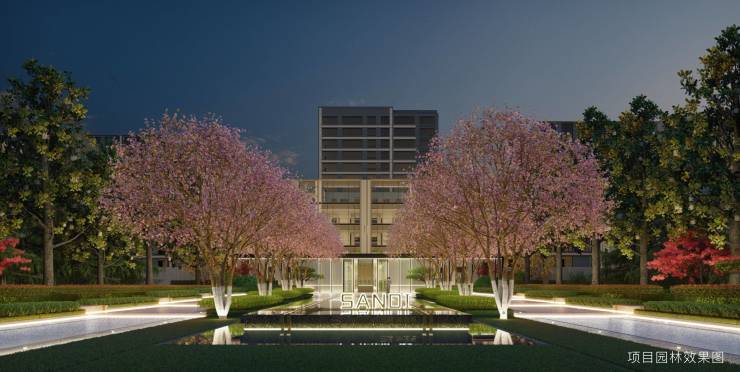 【星空画幕】入口采用树阵的方式强调仪式感,同时将入口门楼遮掩其中,制造若隐若现的神秘感。纯净的镜面影池居中而卧,建筑、林木倒影呈现于此,和镜池形成无声的互动,营造更加舒心安全的社区氛围。
