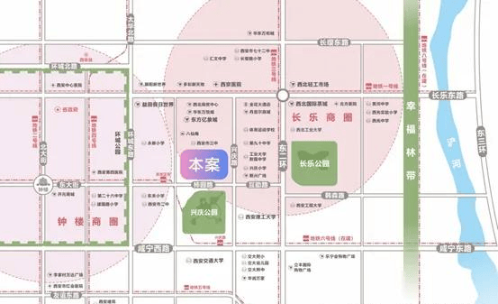 项目坐落于长乐门以东,二环以西,兴庆路与柿园路交汇处东北角