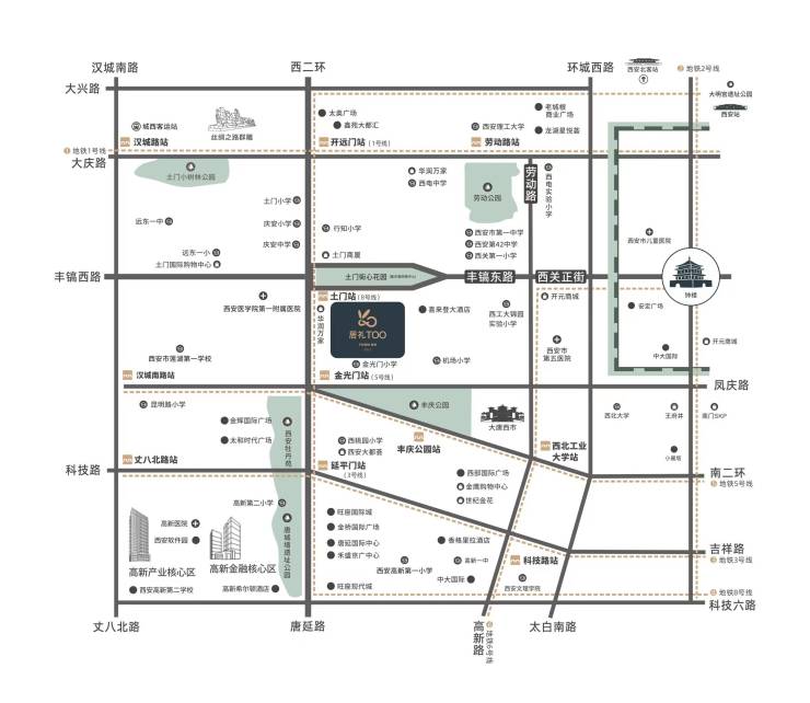 居礼TOO,位于城西核心区域——西二环十字东,地铁8号线(在建)土门站,45000㎡现象级地标建筑,以磅礴姿态焕新城市封面。项目辐射高新、经开、西咸、莲湖四区,贯穿二环与地铁双线交通,汇聚一线产业资源 。