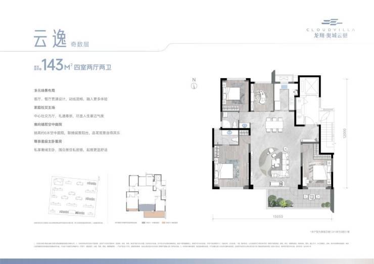 3、户型:第四代升级著作的6米挑空南向超大空中庭院和7.2米大横厅设计,超高得房率,别墅级的空间尺度;