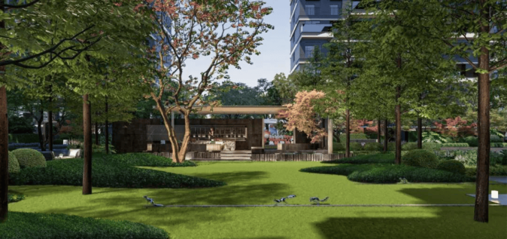 园林规划传承古长安外市内坊格局,融合热闹街区和酒店化空间,打造 “二轴四园” 布局,以“天地四季” 主题花园庭院为精华所在,归家如同微度假,四季皆有不同观感体验。