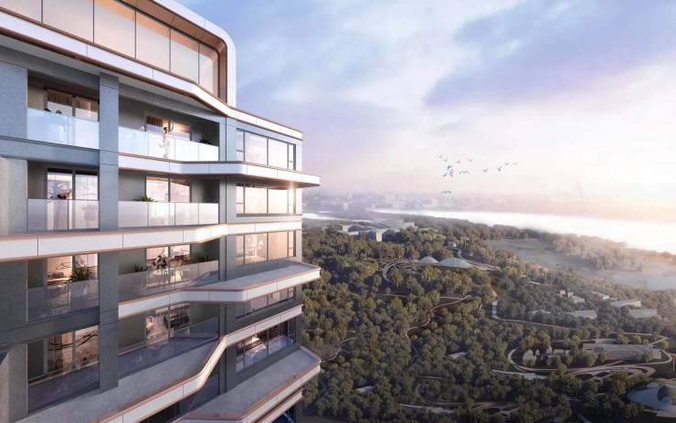 深研人居的美学表达,采用湾流镜面曲线的立面设计,通过自然造物的弧线美学与光影器物得相融合;每户超大南向阳台向外衔接通高约6-6.2米延伸空间,恰如一艘停靠在安静港湾的游艇,随时驶入更广阔更高处的自由之境。