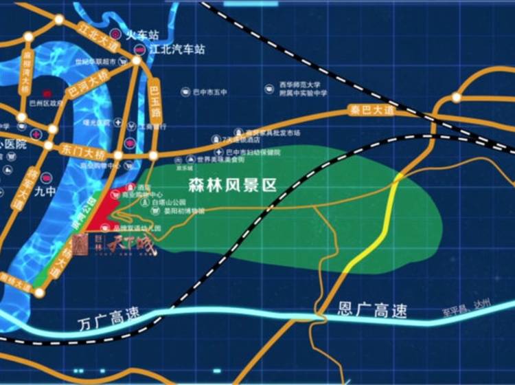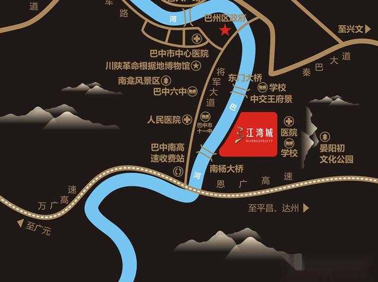 江湾城项目总占地约550余亩,规划总建筑面积约160万平米。以不可复制的稀缺区位配套资源满足业主生活、交通、教育、休闲及娱乐的需求。江湾城小区位于两个发展新区的中心腹地,北连江北大道,东接兴文经济开发区,西连老城主城区,南接恩阳经济开发区。由双向6车道中杨干道全线贯通,交通十分便捷。项目教育设施有幼儿园:5000平米两所高端双语幼儿园;5万平米中小学校。医院有9万平米的二甲康达医院。