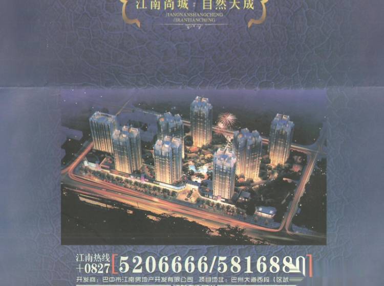江南尚城位于西华山麓,东接巴中市城区主干道,北傍青山绿水,遥望是五星级酒店,规划总用地面积54722.1平方米,其中,建设净用地面积4335805平方米,道路用地面积11363.6平方米。规划设计容积率3.48,建筑密度23.81%,绿地率39.62%。规划总建筑195753.88平方米,其中,地上建筑面积153125.92平方米,地下建筑面积42627.96平方米,地下车库泊车位总数1329个。