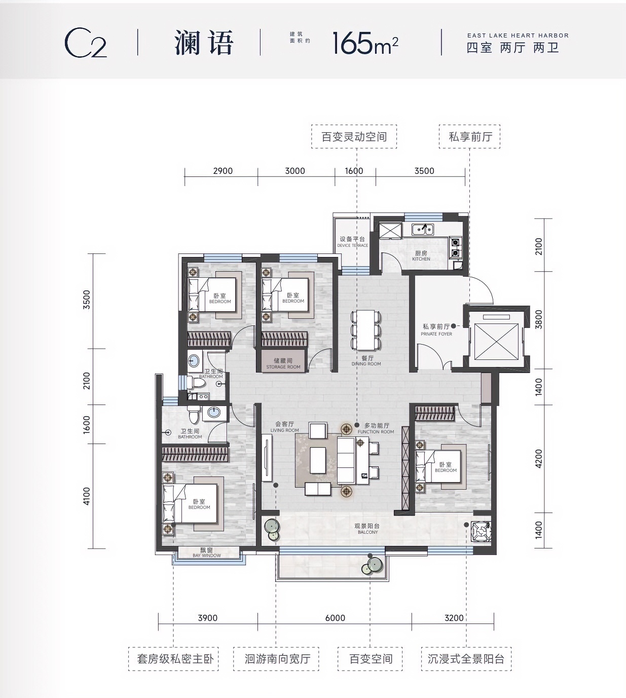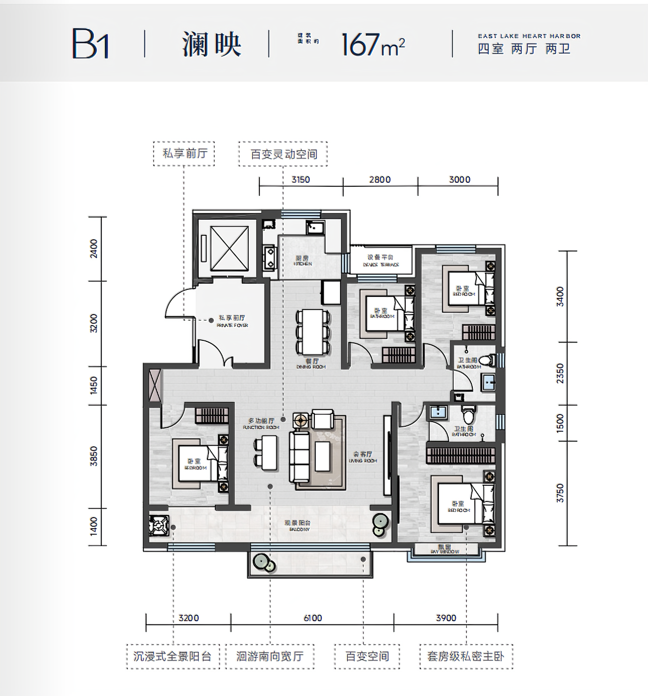 园林设计理念:项目园林以 “曲水润园” 为核心,致敬苏州园林的经典艺术,将东湖之水元素巧妙引入。整体景观以东方精奢为主题,保留土地原生自然之美,融入现代设计元素,构建4大主题景观、6重如澜之境,营造酒店式水院奢享。