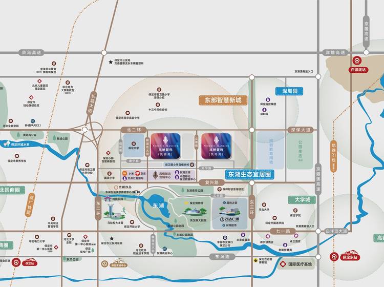 医疗:第一中心医院、保定国际医疗基地(在建)、中华中医药学会保定康复基地(在建)、河北大学附属医院复兴院区(在建)、保定心脑血管医院、保定鹰华眼科医院