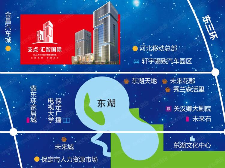 支点·汇智国际,地处保定市莲池区复兴东路999号,此区域为承接京津产业转移的东部桥头堡。项目集生态智能写字楼,高端服务型公寓、时尚创意LOFT及特色商业街区于一体,总建筑面积10万平方米,奢华大气。LOW-E玻璃幕墙外立面、风格硬朗明快、细节简约精致,开创大保定5O商务综合体。
