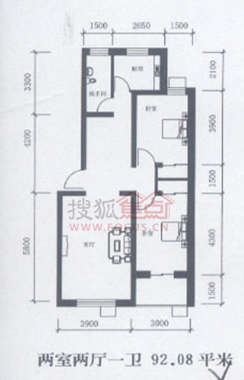 2室2厅1卫-两室两厅一卫 92.08平米