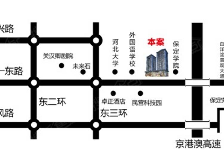 万达广场、关汉卿大剧院、居然之家、容大体育场、东湖公园、保定学院、东湖文化产业园、河北大学