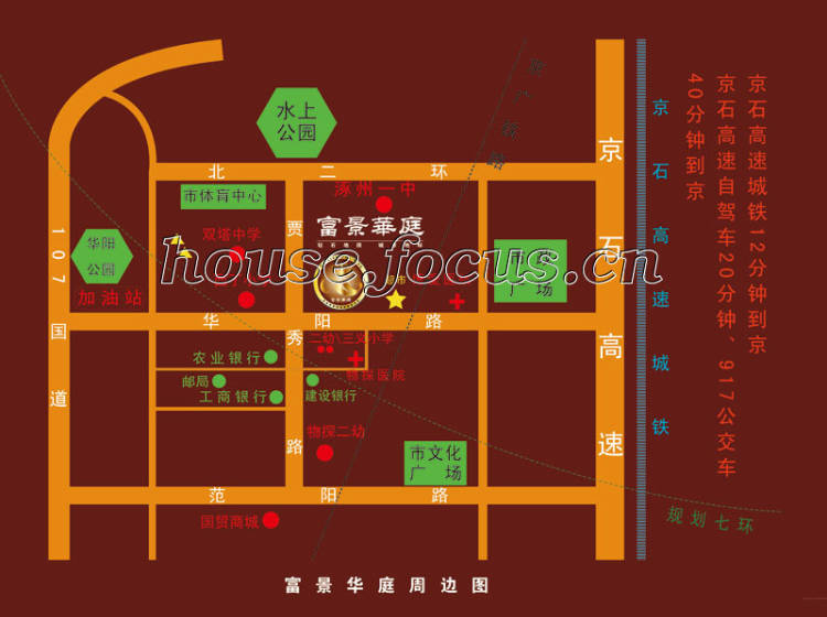 垄断涿州市‘东延北扩’的中心地带,城区少有、钻石地段---华阳路与贾秀路的交汇处,地处市政府确定的现代商业区,与范阳路咫尺相连,是华阳路的大型商业中心,真正 的西面来财,升值无限。项目总建筑面积6万平米,绿化率32%,集商住于一体。周边有涿州市重点小学、重点高中、幼儿园、大型医院,濒临华阳公园及规划的 大型水上公园,西北为市体育中心,东南为市文化广场;107国道和京石高速分居两侧,未来的京石高速铁路近在咫尺,917路公交车直达北京西站。地源热泵地板采暖,集夏季制冷、冬季供暖、全年生活热水于一身,可视楼宇对讲,赠送先进的太阳能提供24小时热水。