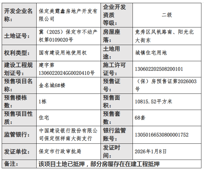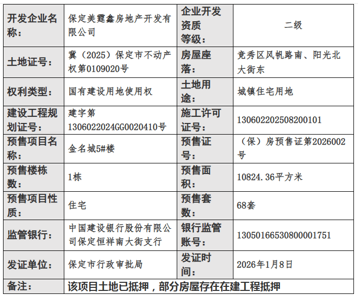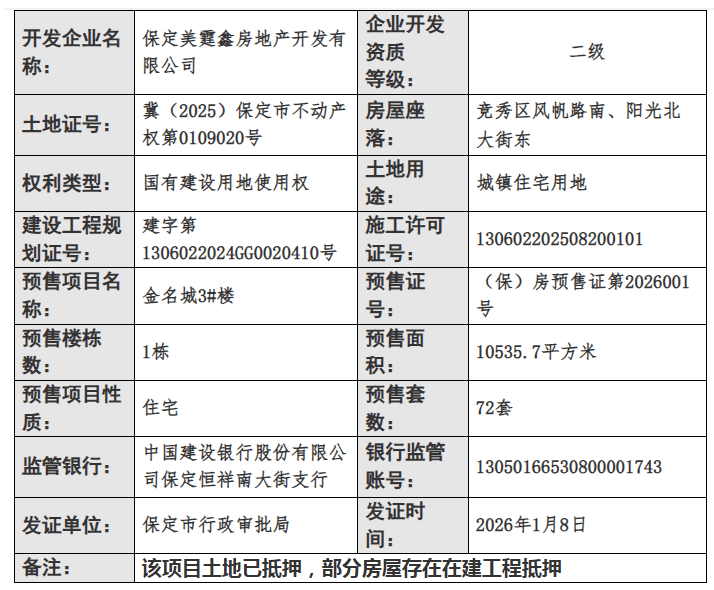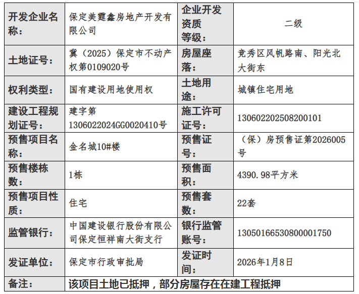 2026年1月8日,保定市行政审批局公布最新商品房预售许可证下发信息,金名城项目3#、5#、6#、9#、10#获发预售证,预售总房源256套。