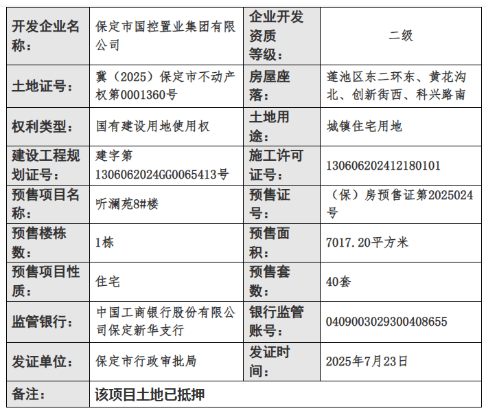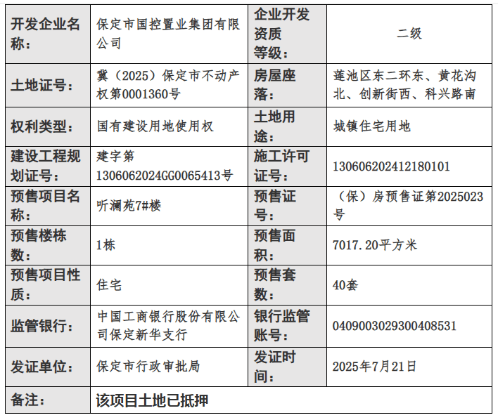 2025年7月21日,保定市行政审批局公布最新商品房预售许可证下发信息,听澜苑7#楼、8#楼获发预售证,其中7#楼预售面积7017.20平方米,预售套数40套,预售证号(保)房预售证第2025023号。8#楼预售面积7017.20平方米,预售套数40套,预售证号(保)房预售证第2025024号。