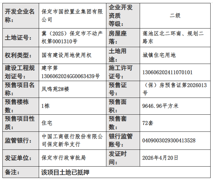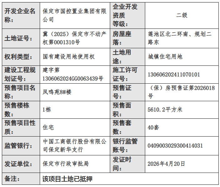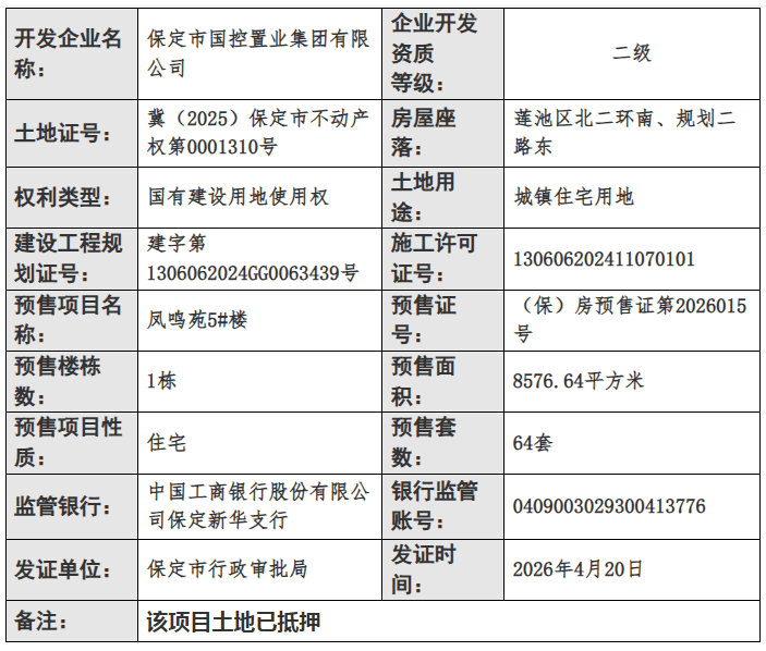 2026年4月20日,保定市行政审批局公布了最新商品房预售许可证下发信息,凤栖麓鸣项目1、2、3、5、6、7、8号楼获发预售证,总预售房源402套。