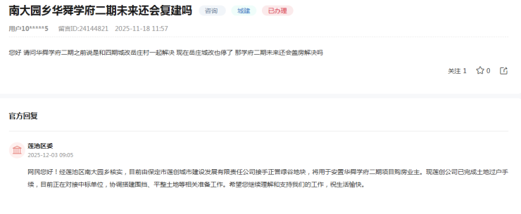 近日从领导留言板获悉,莲池区南大园乡就群众关注的华舜学府二期项目复工问题作出明确回应。