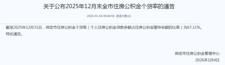 2026年1月4日, 保定市住房公积金管理中心公布12月末全市住房公积金个贷率。截至2025年12月31日,保定市住房公积金个贷率(个人住房公积金贷款余额占住房公积金缴存余额的比率)为67.11%。