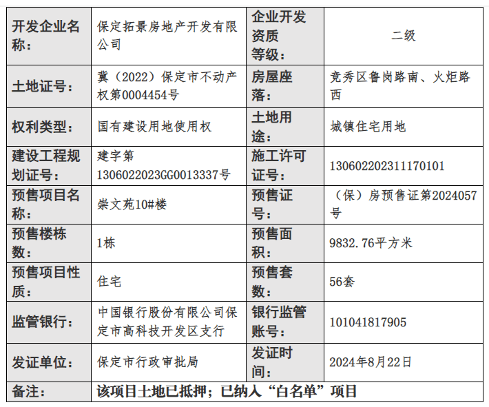 2024年8月22日,保定市行政审批局公布了一则商品房预售许可证下发信息,国今风华项目崇文苑10#楼获发预售证,预售面积9832.76平方米,预售套数56套,预售证号(保)房预售证第2024057号。