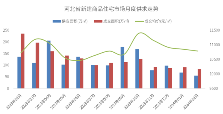 据cric环京投资决策系统显示,2024年2月河北省新建商品住宅新增供应面积55.0万平方米,环比下跌20.2%,同比下跌59.7%;成交面积83.8万平方米,环比下跌8.7%,同比下跌64.5%;成交均价为10791元/㎡,环比下跌0. 58%,同比上涨0.53%。1-2月河北省新建商品住宅新增供应面积123.9万平方米,同比下跌50.8%;成交面积175.6万平方米,同比下跌51.8%;