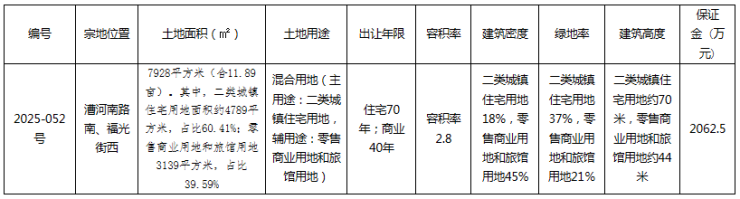 2025年8月13日,保定市公共资源交易中心发布国有建设用地使用权拍卖出让公告。主城区2025-052号地块拍卖出让,地块位于漕河南路南、福光街西,为混合用地(主用途:二类城镇住宅用地,辅用途:零售商业用地和旅馆用地),拍卖地块面积7928平方米(合11.89亩)。其中,二类城镇住宅用地面积约4789平方米,占比60.41%;零售商业用地和旅馆用地3139平方米,占比39.59%,约11.89亩,容积率为2.8,。