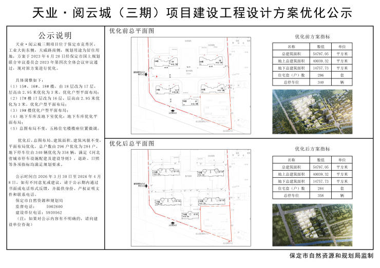 天业·阅云城三期项目位于保定市竞秀区,工业大街东侧,天威路南侧,规划用途为居住用地,方案于2023年6月20日经保定市国土规划联合审议委员会2023年第四次全体会议审议通过,现对原方案进行优化。具体调整如下:
