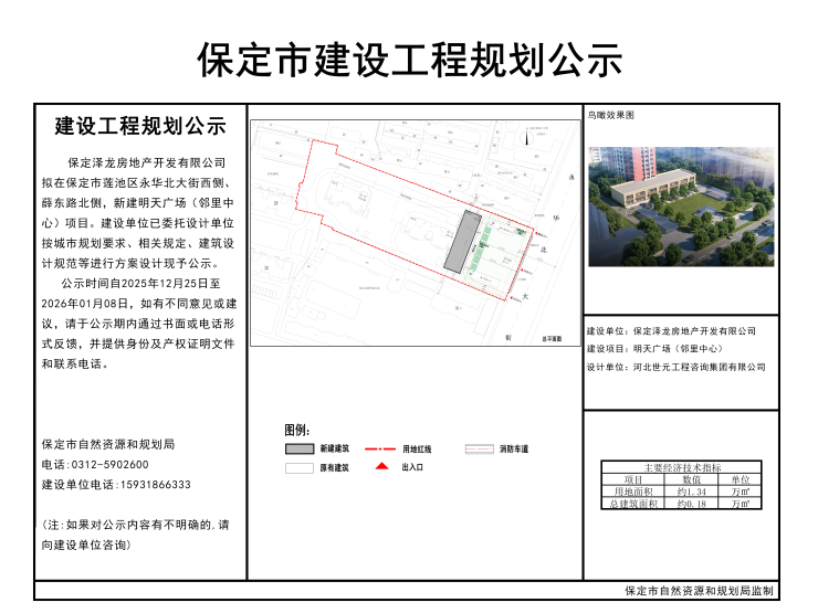 保定泽龙房地产开发有限公司拟在保定市莲池区永华北大街西侧、薛东路北侧,新建明天广场(邻里中心)项目。建设单位已委托设计单位按城市规划要求、相关规定、建筑设计规范等进行方案设计现予公示。