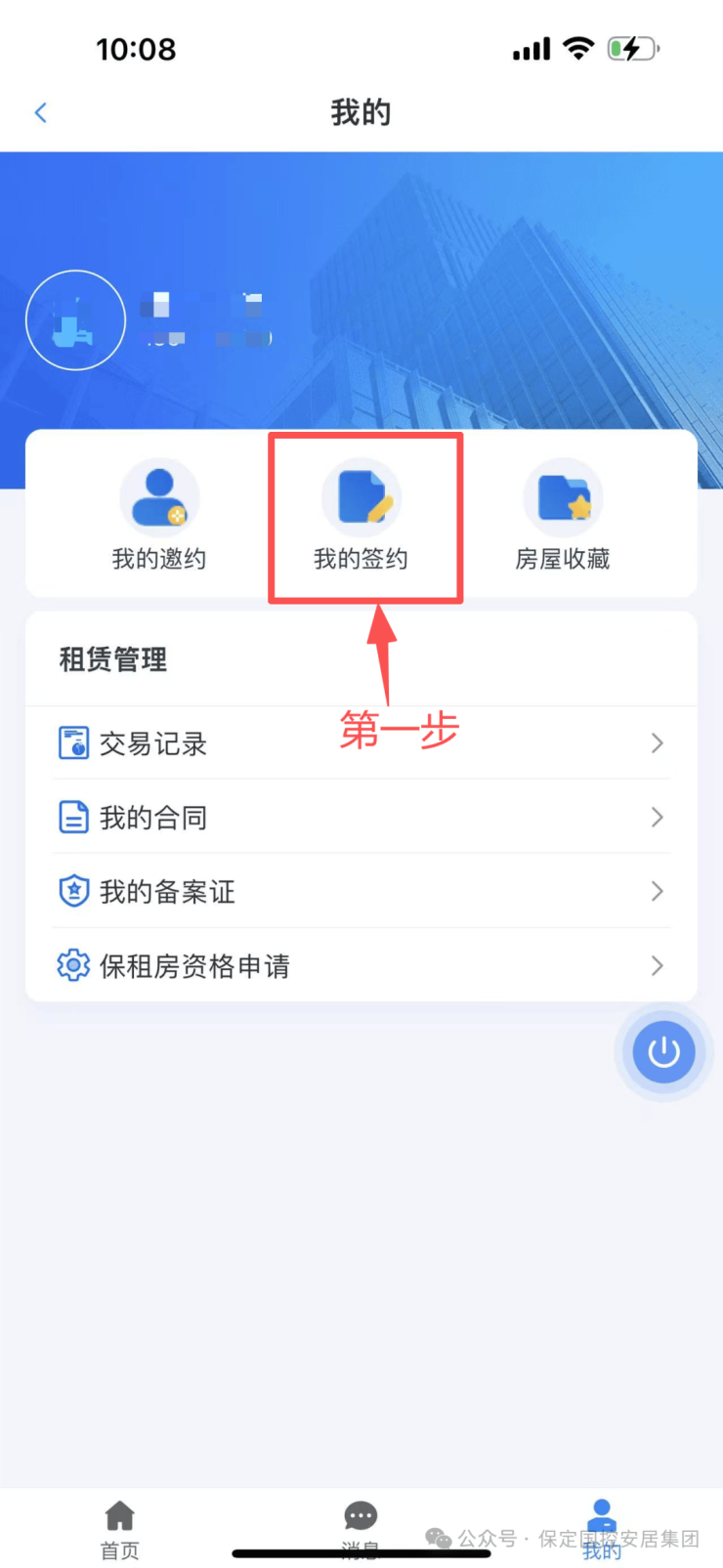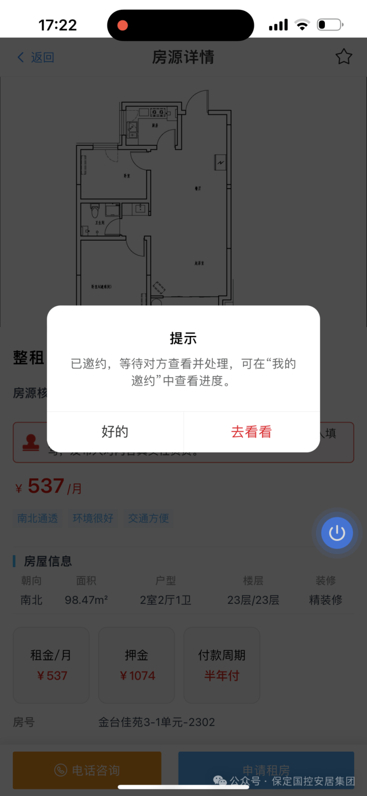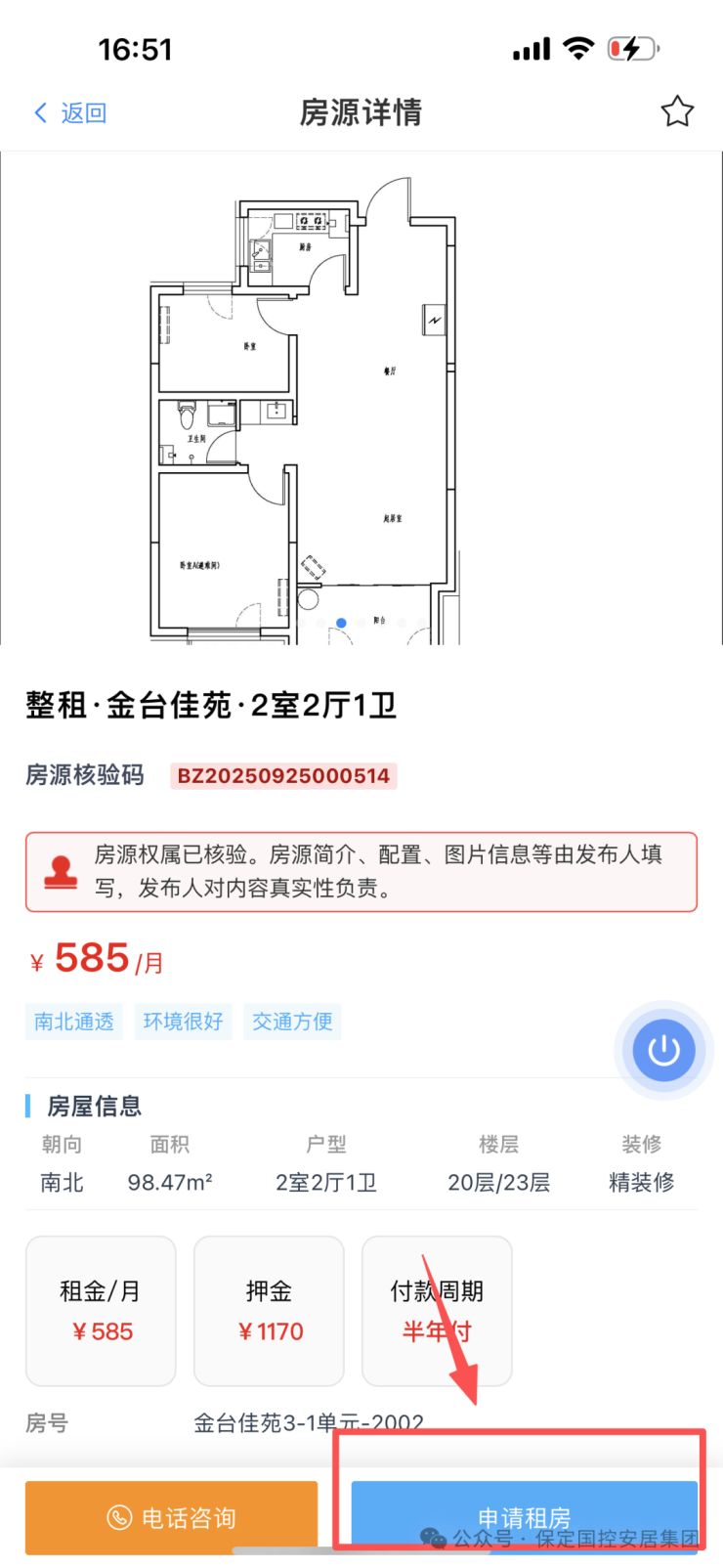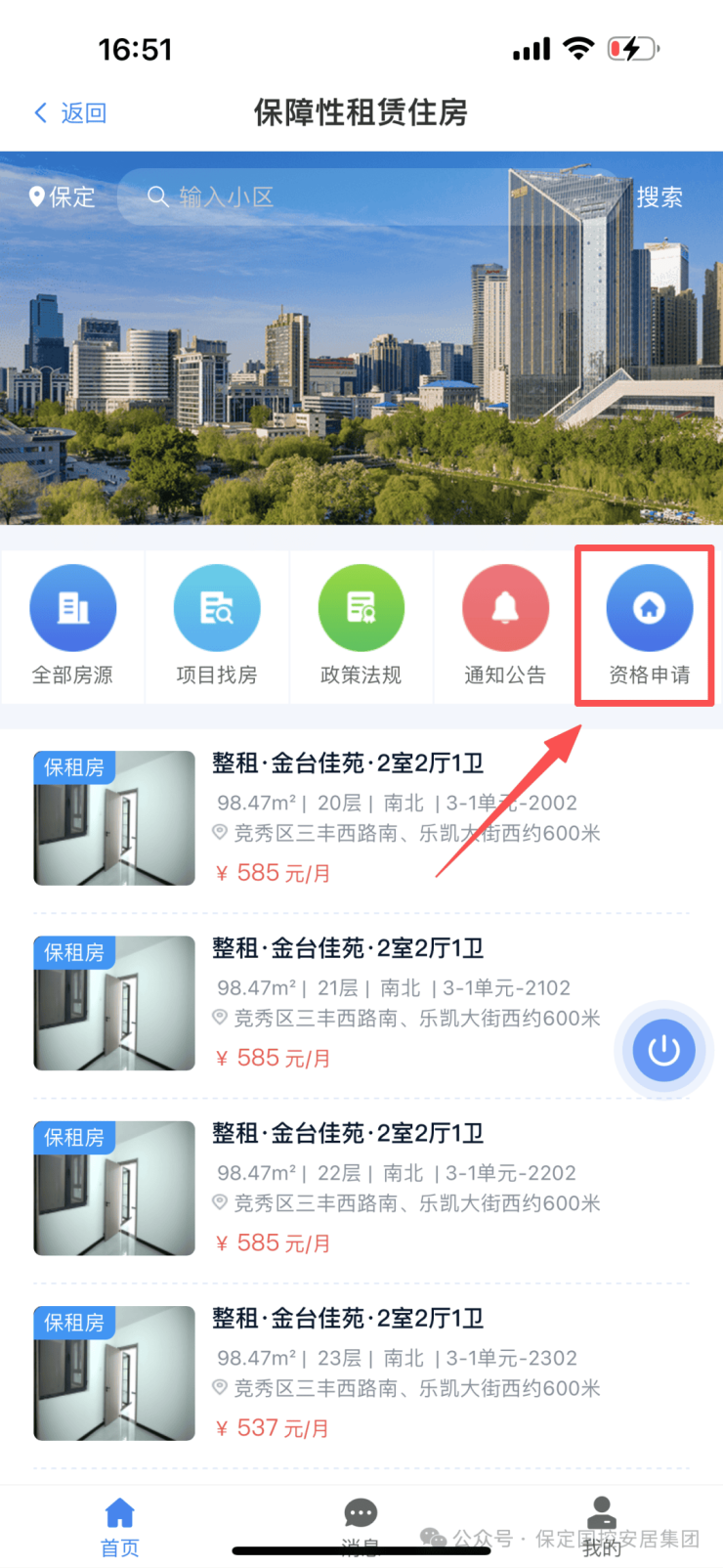 1.审核通过后,点击“首页”→在搜索栏搜索并点击“保定保租房”,选定意向房源 → 点击“申请租房”。