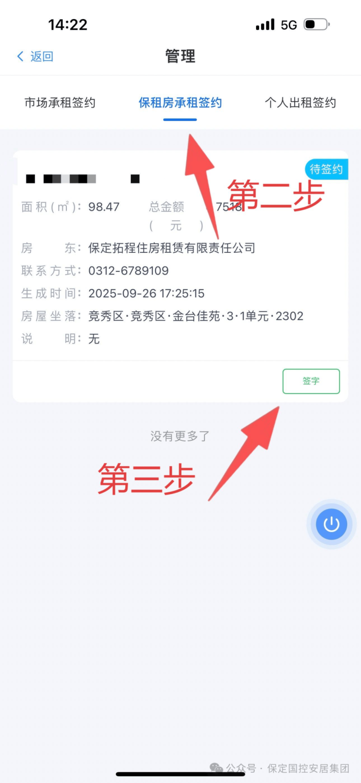 3.待企业发起合同后,依次点击“我的签约”→“保租房承租签约”→“签字” 处查看合同。
