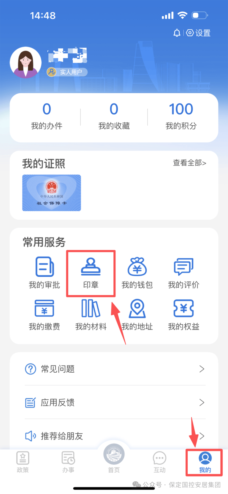 在“我的”页面,点击“印章”,完成人脸识别。