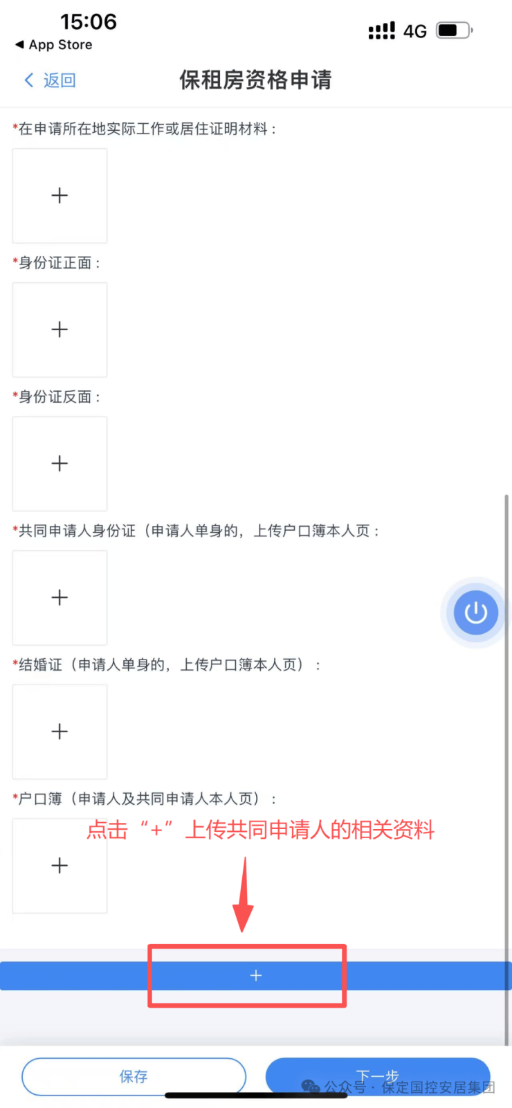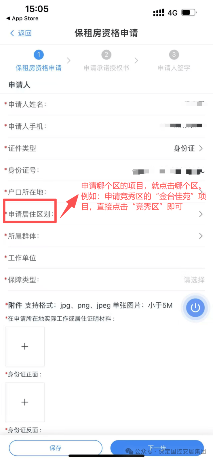 点击“资格申请”,填写申请人信息。按意向项目所在地(莲池区或竞秀区或高新区)申请居住区域。
