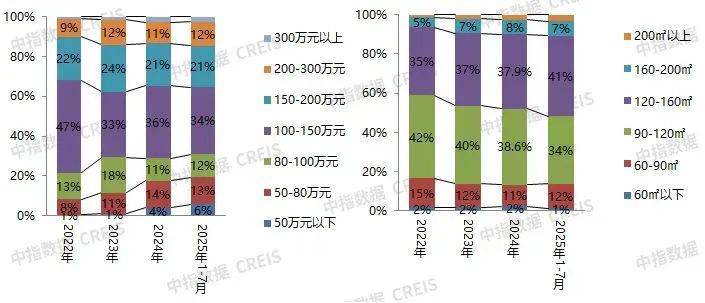总价100-150万、面积段90-120平之间产品累计成交占比同比下滑较大。成交总价段来看,100-150万之间产品成交占比34%,较2024年减少2.5个百分点,但仍居首位;150-200万之间产品成交占比为21%,居第次席,较2024年减少0.7个百分点;200-300万之间产品成交占比为12%,较去年全年增加1.5个百分点;80万以下产品累计成交占比为19%,较去年全年占比增加1.8个百分点;成交面积段来看,120-160平之间产品成交占比为41%,居首位,较去年增加3.2个百分点;90-120平之间产品成交套数占比居次席,占比为34%,占比下滑4.1个百分点;60-90平之间产品成交占比约为12%,较去年全年占比增加1.3个百分点;160平以上产品成交占比约为11%,较去年全年占比增加约0.6个百分点。