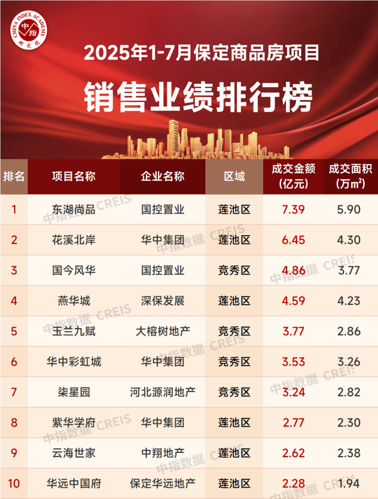 根据中指研究院监测显示,2025年1-7月,保定TOP10房企合计销售金额为57.64亿元,合计销售面积48.36万平。销售额方面,TOP10门槛值为2.06亿元,华中集团销售金额达13.82亿元,位列排行榜首位;国控置业实现销售业绩12.24亿元,位列第二名;爱情地产销售金额约为6.26亿元,位列第三名。销售面积方面,TOP10门槛值为1.59万平,华中集团、国控置业、爱情地产分列销售面积榜单前三位,销售面积分别为10.71万平、9.67万平、6.39万平。