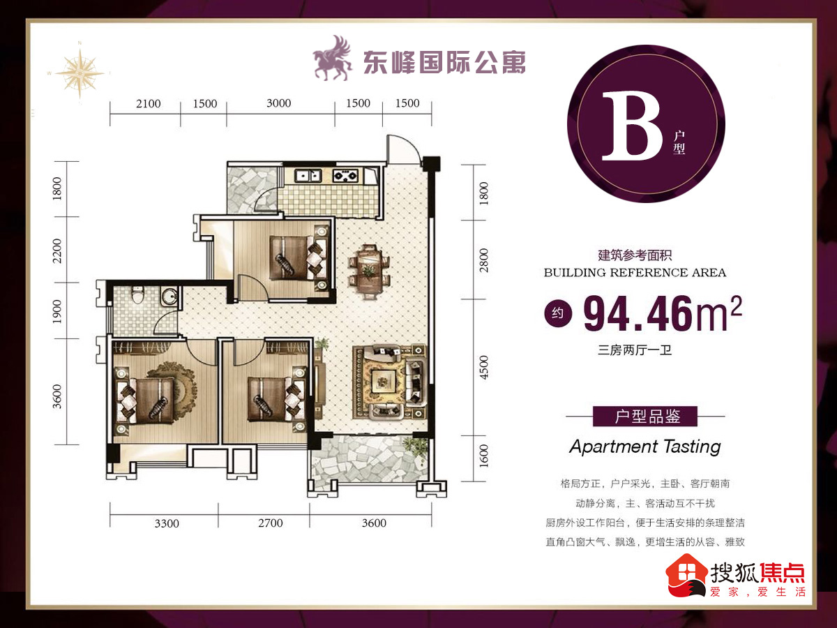 3室2厅1卫-B户型 建面约94平 三室两厅